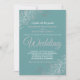 Este convite para o casamento apresenta uma design simples, mas elegante, com cinzas e letras brancas em um fundo teal. A simplicidade do design é compensada pelas bobinas de folha fina prateada nos cantos. O rico é ornamentado e floral e fornece um bom contraste com o texto subestimado. A formulação é formal e tradicional, mas a apresentação gráfica torna-a moderna e acessível.