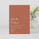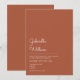 Convite de casamento minimalista com um design clássico que apresenta os nomes do casal feliz em uma fonte elegante acima dos detalhes especiais do casamento em um fundo de terracota. Concebido por Thisisnotme©