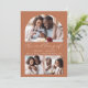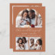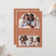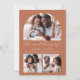 Este convite de casamento simples e minimalista apresenta uma colagem de 3 fotos, com uma foto em forma de arco no topo e duas fotos quadradas menores no fundo. No meio, as palavras "o casamento de" aparecem na elegante escrita branca, seguida pelos nomes dos casais, data do casamento e cidade em sans serif, em um fundo de terracota. Adicione uma quarta foto junto com o convite e uma mensagem mais detalhada no sentido inverso.