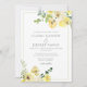 Delicar as flores amarelas da aquarela decoram este adorável convite de casamento de verão. O convite para o casamento do jardim é acentuado com uma delicada faixa verde retangular verde e folhas botânicas debaixo dos elegantes e ensolarados. Floral e leve, perfeito para uma cerimônia ao ar livre.