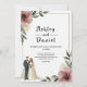 Este elegante convite de casamento floral de aquarela é perfeito para um casamento moderno. A design romântica apresenta uma elegante estrutura floral de aquarela com uma ilustração noiva e noiva e caligrafia preta sobre fundo branco.