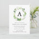 Elegante convite de casamento botânico com seu monograma inicial cercado por uma coroa de folhagem de aquarela em tons de primavera e verde-musgo. Personalize o convite de casamento Boho Greenery com seus detalhes de casamento. O convite de casamento botânico moderno é perfeito para casamentos de primavera e verão.