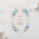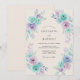 Este design apresenta um arranjo delicado de rosas em aquarela em tons refrescantes de verde hortelã e lavanda suave. Folhagem exuberante em tons de azul-turquesa e roxo cria uma atmosfera aérea e romântica contra um fundo de marfim quente. A estética pintada à mão captura um sentimento caprichoso, perfeito para um evento sofisticado e etéreo. Cada flor é renderizada com lavagens suaves de cor para evocar um senso de elegância atemporal.