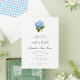 O texto formal e elegante fácil de personalizar convida os convidados a celebrar a união de um casal no casamento. O novo estilo tradicional do milênio apresenta uma paleta nítida de cor azul e verde francês com muito branco claro e láteo e uma ilustração perfeita de flor azul de hydrangea.