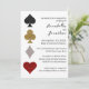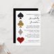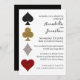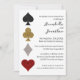 Este convite elegante de casamento apresenta um tema do casino de Las Vegas. Os quatro naipes de um baralho são impressos à esquerda. A pá é impressa em um design preto brilhante, o clube é ouro, o diamante é prata e o coração é um design vermelho brilhante. As informações do casamento são impressas à direita em uma fonte preta sofisticada.