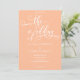 Incêndio no charme eterno do nosso Elegante Convite para Casamento de Pêssego do Script de Caligrafia Romântica, uma obra-prima que harmoniza a elegância moderna com o romance clássico. O convite apresenta uma caligrafia refinada e romântica num negro sofisticado, criando um design minimalista, mas impactante. Num pano de fundo belo, esse convite é uma celebração da simplicidade e da estética refinada. A cor de pêssego cuidadosamente escolhida dá calor e alegria à apresentação geral, estabelecendo a palco de um casamento que exumenta elegância e amor. As curvas graciosas da escrita e a paleta de cores subjugada criam um convite que é inegavelmente simples como é inegavelmente bonito. Convide seus convidados a compartilhar a magia de seu dia especial com este Convite para Casamento de Pêssego do Script de Caligrafia Romântica Elegante. Não é apenas um convite; é uma peça de arte que encapsula a essência da sua história de amor numa mistura de caligrafia de eterno, design minimalista, e o suave prazer do pêssego. Que este convite seja o prelúdio perfeito para a bela celebração que se aguarda. Corresponder a outros itens da coleção.