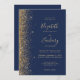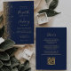 A borda esquerda deste elegante convite de casamento moderno apresenta um design dourado falso. O texto personalizável combina manuscrito dourado, fontes em copperplate e itálico em um fundo azul marinho. O verso fornece espaço para detalhes do casamento em um fundo azul de marinho sólido, junto com um código QR que os convidados podem digitalizar para visitar seu site e RSVP, o que economiza o custo de imprimir e enviar cartões RSVP separados.