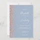 A margem esquerda deste elegante convite de casamento moderno apresenta um rosa dourado faux glitter design. O texto personalizável combina manuscrito branco, fontes em copperplate e itálico em um fundo azul empoeirado. O verso fornece espaço para detalhes do casamento em um fundo azul empoeirado sólido, junto com um código QR que os convidados podem digitalizar para visitar seu site e RSVP, o que economiza o custo de imprimir e enviar cartões RSVP separados.