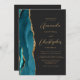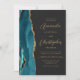 A borda esquerda deste elegante convite de casamento moderno apresenta uma cor azul-lacrimogênea agata borda com falsa brilho dourado. O texto personalizável combina o script dourado e as fontes sans serif em um fundo preto de slate. O verso fornece espaço para detalhes do casamento em um fundo preto de slate sólido, junto com um código QR que os convidados podem digitalizar para visitar seu site e RSVP, o que economiza o custo de imprimir e enviar cartas RSVP separadas.