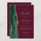 A borda esquerda deste elegante convite de casamento moderno apresenta uma esmeralda verde aquarela agate borda com falsa brilho dourado. O texto personalizável combina manuscritos dourados, copperplate e fontes itálicas em fundo burgundy. O verso fornece espaço para detalhes do casamento em um fundo de burgundy sólido, junto com um código QR que os convidados podem digitalizar para visitar seu site e RSVP, o que economiza o custo de imprimir e enviar cartões RSVP separados.
