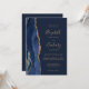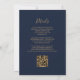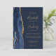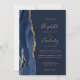 A borda esquerda deste elegante convite de casamento moderno apresenta um marinho azul de aquarela agata borda aparada com falso brilho dourado. O texto personalizável combina manuscrito dourado, fontes em copperplate e itálico em um fundo azul marinho. O verso fornece espaço para detalhes do casamento em um fundo azul de marinho sólido, junto com um código QR que os convidados podem digitalizar para visitar seu site e RSVP, o que economiza o custo de imprimir e enviar cartões RSVP separados.