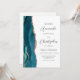 A borda esquerda deste elegante convite de casamento moderno apresenta uma cor azul-lacrimogênea agata borda com falsa rosa dourada. O texto personalizável combina o script de cinza de carvão e as fontes sans serif em um fundo branco. O verso oferece espaço para detalhes do casamento, juntamente com um código QR que os convidados podem digitalizar para visitar seu site e RSVP, o que economiza o custo de impressão e envio de cartões RSVP separados.