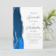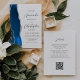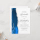 A borda esquerda deste elegante convite de casamento moderno apresenta uma cor azul real de água agada borda com falso brilho prateado. O texto personalizável combina o script de cinza de carvão e as fontes sans serif em um fundo branco. O verso oferece espaço para detalhes do casamento, juntamente com um código QR que os convidados podem digitalizar para visitar seu site e RSVP, o que economiza o custo de impressão e envio de cartões RSVP separados.