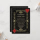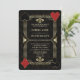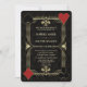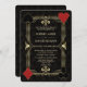 Glamorous Casino Royale e Art Deco 20s — design do cartão temático. Apresenta o estilo antigo de deco artístico, uma antiga estrutura de ouro falsa de Hollywood, de 1920, jogando naias (simulando cartas de jogar), sobre fundo do padrão de Deco Arte Negra Ouro. É utilizada uma redação especial no jogo de pôquer. No verso do padrão de Deco de Arte dourada, código QR e iniciais entre os trajes de jogar cartas. Use a ferramenta Personalizar para adicionar suas informações. Para mais, visite, por favor, minha Coleção de Casamentos Glam Roaring 20.