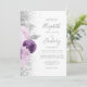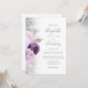 O canto esquerdo deste elegante convite para casamento moderno apresenta um buquê floral em tons de roxo e lavanda, aparado com folha de falso prateado e folhagem falsa e aspergido com brilho de prata. O texto personalizável combina o script de escrita manual de cinzas, as fontes em copperplate e itálico em um fundo branco. O verso fornece espaço para detalhes do casamento em um fundo branco sólido, junto com um código QR que os convidados podem digitalizar para visitar seu site e RSVP, o que economiza o custo de imprimir e enviar cartões RSVP separados.