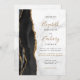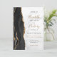 A borda esquerda deste elegante convite de casamento moderno apresenta uma coloração aquosa preta, borda agitada, aparada com falso brilho dourado. O texto personalizável combina um script de manuscrito dourado com fontes em preto e itálico em uma cinza e fundo de mármore branco. O verso fornece espaço para detalhes do casamento em um fundo de mármore, juntamente com um código QR que os convidados podem digitalizar para visitar seu site e RSVP, o que economiza o custo de imprimir e enviar cartões RSVP separados.