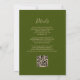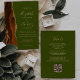 A borda esquerda deste elegante convite de casamento moderno apresenta uma cor de água laranja queimada, aparada com falsa brilho dourado. O texto personalizável combina a letra de mão, a de cobre e a de itálico em um fundo verde-oliva. O verso fornece espaço para detalhes do casamento em um fundo verde-oliva sólido, junto com um código QR que os convidados podem digitalizar para visitar seu site e RSVP, o que economiza o custo de imprimir e enviar cartões RSVP separados.