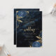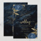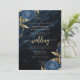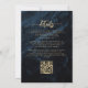 Este elegante convite para o casamento apresenta buquês florais azuis saltados com verde folha de ouro em dois cantos, em uma imagem de fundo de agate de cor azul marinho. O texto personalizável combina fontes de serifa, itálico e escrita manual douradas. O verso oferece espaço para detalhes do casamento, juntamente com um código QR que os convidados podem digitalizar para visitar seu site e RSVP, o que economiza o custo de impressão e envio de cartões RSVP separados.