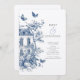 Casamento do Código QR Rustic Blue Toile De Jouy. Personalize facilmente as palavras para seus próprios detalhes. Um design floral azul toile de jouy à esquerda na frente e menor no verso. Adicione seu código QR ao seu site de casamento no verso para que seus convidados possam RSVP e ver todos os detalhes on-line sem a necessidade de gabinetes separados.