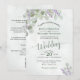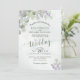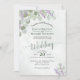 Estes belos convites para o casamento apresentam um design bócio rústico com folhas de cor d'água pintadas à mão, folhas de eucalipto e galhos de lavanda e jardim em um fundo azul empoeirado e empoeirado. A inscrição é feita em verde-sábio e preto e a tipografia apresenta a caligrafia de script de rico. A parte traseira tem uma seção de detalhes com espaço para informações adicionais sobre hotel, recepção, registro, direções, rsvp ou quaisquer informações adicionais que seus convidados possam exigir, juntamente com um código QR personalizável direcionando-os para seu site.