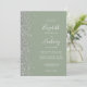 A margem esquerda deste elegante convite de casamento moderno apresenta um design de cintilação de prata. O texto personalizável combina manuscrito branco, fontes em copperplate e itálico em um fundo verde sábio. O verso fornece espaço para detalhes do casamento em um fundo verde de sábio sólido, junto com um código QR que os convidados podem digitalizar para visitar seu site e RSVP, o que economiza o custo de imprimir e enviar cartões RSVP separados.
