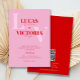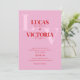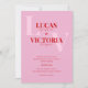 Faça uma declaração com o nosso design de convite de casamento rosa e moderno. Com cores brilhantes e tipografia contemporânea, esse convite é perfeito para casais que querem mostrar seu estilo único. Se quiser modificar o texto, selecione "Detalhes". Para ajustar a posição, a fonte ou a cor do texto, clique em "Editar usando a Ferramenta de Design".