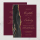 A borda esquerda deste elegante convite de casamento moderno apresenta uma coloração aquosa preta, borda agitada, aparada com falso brilho dourado. O texto personalizável combina manuscritos dourados, copperplate e fontes itálicas em um fundo vermelho arrojado. O verso fornece espaço para detalhes do casamento em um fundo sólido de burgundy, junto com um código QR que os convidados podem digitalizar para visitar seu site e RSVP, o que economiza o custo de imprimir e enviar cartões RSVP separados.