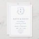 Anuncie seu dia especial em estilo eterno com este Casamento do Monograma Azul Salve a Data! Apresentando um delicado design floral francês da chinoiserie em tons de azul macio, este charmoso cartão dá o tom perfeito para o seu casamento. Os detalhes intrincados acrescentam um toque romântico e sofisticado, fazer-o uma escolha ideal para casais que amam elegância clássica. Não se esqueça de comprar o resto da coleção para completar sua suíte de casamento com convites, cartazes e muito mais!
