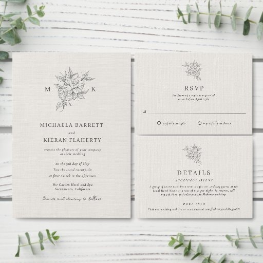 Convite de casamento tradicional num papel branco bege com flor botânica e design de monograma. Personalize com seus detalhes de casamento. Você tem uma solicitação de personalização? Contacte-me, ficaria feliz em ajudar.