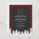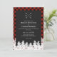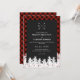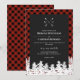Convite de casamento russo com um padrão de checagem de búfalo vermelho, suas iniciais em um monograma de flecha cruzada. No final do convite de casamento rústico, a neve cobria as ondas.