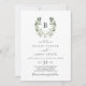 Este convite de casamento do monograma do ramo de oliveira moderno é perfeito para um casamento de boho. O design rústico, porém elegante, apresenta folhas botânicas de cor aquática simples e azeitonas pretas num pequeno galho com um toque mediterrânico clássico. Personalize o cartão com seu último monograma inicial.