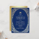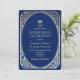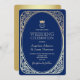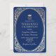 Elegante e formal, este convite de casamento azul e ouro marinho apresenta um monograma real com uma coroa de ouro, cercado por intrincadas bordas botânicas ao estilo da folha de alumínio. Perfeito para uma celebração luxuosa e tradicional de casamento, ele destaca as iniciais do casal e os detalhes do evento com a tipografia clássica. Ideal para assuntos formais de gravatas negras ou casamentos noturnos. Personalize com seus próprios nomes, data e local para um eterno, toque real.