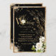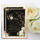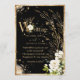 Um brilhante spray botânico floral branco com folhas esparsas de ouro sobre pendurar este belo convite de casamento sobre fundo negro. O fundo rústico é um olhar elegante e rico. Este é um convite adorável. Amarrou-se na falsa brilha do ouro para dar o tom à elegância romântica e clássica. Douradas malhas terminam este bonito convite para casamento. Bonita para qualquer estação.
