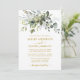 O Cartão de Convite para Casamento de Cores Biológicas Elegantes Modernos inclui folhas de eucalipto, folhagem botânica verde, folhas azuis empoeiradas e outros belos lençóis botânicos. Dourado Script.