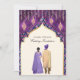 Incêndios para seus convidados com este elegante convite de casamento indiano com um belo arco decorado com cortinas e lanternas penduradas com ilustrações de casal personalizáveis em várias combinações de cores de sherwani, lehenga e turban. Basta adicionar os detalhes do seu evento neste modelo fácil de usar para torná-lo um convite de tipo único.