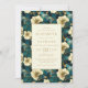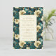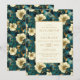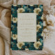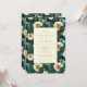 Um elegante design botânico que apresenta um padrão floral exuberante em creme, ouro e lacre fornece o fundo para o texto dourado num retângulo de creme pálido. O padrão floral é repetido na parte de trás do cartão.
