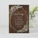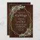 Com a elegante escrita moderna, este convite para o casamento, de formato invernal, apresenta uma estrutura geométrica dourada decorada com verde-aquarela, cones de pínus e galhos verdes do inverno, acentuados com groselhas de neve, com fundo de madeira rústica escura. ajustes ou mais produtos correspondentes.