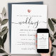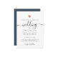 Este convite de casamento chique brilha com simplicidade. Tipografia moderna, caligrafia deslumbrante acentuada por um coração bonito em ouro rosa, impresso, esta suite é mínima e elegante. Espaço para mais detalhes no verso (ou deixar vazio). Esta é a versão de fundo azul de tons de terra escuros - a cor é facilmente personalizada na ferramenta design sob "personalizar mais".