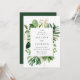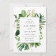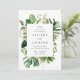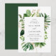 Elegantes convites de casamento tropicais com seus detalhes de casamento enquadrados por uma borda de folhas tropicais aquáticas em tons de verde elogiados por folhagem dourada. O convite reverte para um fundo verde-escuro. Projetado para coordenar com a nossa coleção de casamento Dourada Tropical.