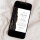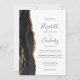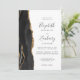 A borda esquerda deste elegante convite de casamento moderno apresenta uma coloração aquosa preta, borda agitada, aparada com falso brilho dourado. O texto personalizável combina manuscrito, copperplate e fontes itálicas em cinzas de carvão em um fundo branco. O verso apresenta um design de agate preto e dourado correspondente.
