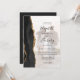 Este elegante design de casamento apresenta uma foto vertical do casal amolecida com uma tela branca para destacar a camada de texto. A borda esquerda apresenta uma borda preta de aquarelas aparada com falso brilho dourado. O texto preto personalizável combina escrita manual, impressão e fontes itálicas. O verso apresenta uma borda de flutuação entre preto e ouro. O verso fornece espaços para 5 fotos adicionais (3 horizontais 1 quadrado e 1 vertical) e espaço para o seu site de casamento URL ou outra mensagem breve.