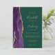 A borda esquerda deste elegante convite de casamento moderno apresenta uma cor d'água roxa, borda agitada, aparada com falso brilho dourado. O texto personalizável combina manuscritos dourados, placas de impressão e fontes itálicas em um fundo verde esmeralda. O verso apresenta um design de agate roxo e dourado correspondente.