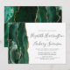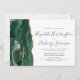 A borda esquerda deste elegante convite de casamento moderno apresenta uma esmeralda verde aquarela agate borda com falsa brilho dourado. O texto personalizável combina manuscrito, copperplate e fontes itálicas em cinzas de carvão em um fundo branco. O verso apresenta um design emerald verde e dourado.