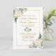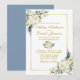 Watercolor Ivory White Floral Greenery Wedding Cartão de Convite para Casamento inclui rosas brancas de creme de marfim e verde botânico. Dourado Quadro, Escrita Dourada, Azul Dusty De Volta.