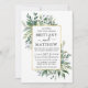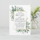 O Cartão de Convite para Casamento de Molerna Botânica de Cor Biológica Delicada Moderna inclui folhagem verde, folhas azuis empoeiradas, folhas verdes de sábio e outras lindas culturas botânicas. Dourado quadro. Foto de volta.