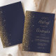 A borda esquerda deste elegante convite de casamento moderno apresenta uma borda falsa de ouro. O texto personalizável combina manuscrito colorido de ouro pálido, fontes copperplate e itálico em um fundo azul escuro. O verso apresenta um design de brilho azul escuro e dourado.