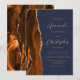 A borda esquerda deste elegante convite de casamento moderno apresenta uma cor de água laranja queimada, aparada com falsa brilho dourado. O texto personalizável combina o script dourado e as fontes sans serif em um fundo azul marinho escuro. O verso apresenta uma design de cor laranja queimada e dourada.