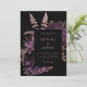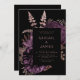 Este elegante e meloso convite de casamento apresenta um buquê floral romântico e luxuoso em roxo com folha de ouro rosa e folhagem brilhante num fundo negro. Personalize o texto cor-de-rosa rosa em fontes na moda num retângulo preto. A parte traseira da placa é preta e sólida.
