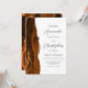 A borda esquerda deste elegante convite de casamento moderno apresenta uma cor de água laranja queimada, aparada com falsa brilho dourado. O texto personalizável combina o script de cinza de carvão e as fontes sans serif em um fundo branco. O verso apresenta uma design de cor laranja queimada e dourada.