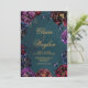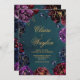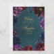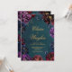 Um convite para o casamento de tom de joia com um azul-lacrimogêneo/verde, azul-safira, ametista roxo e vermelho-bordéus numa sinfonia de tons de joias profundas com spray de ouro e contornos florais. Seus nomes se renderam em um roteiro de casamento de ouro rústico, com uma pequena fonte moderna não serif em maiúsculas anunciando seus detalhes.